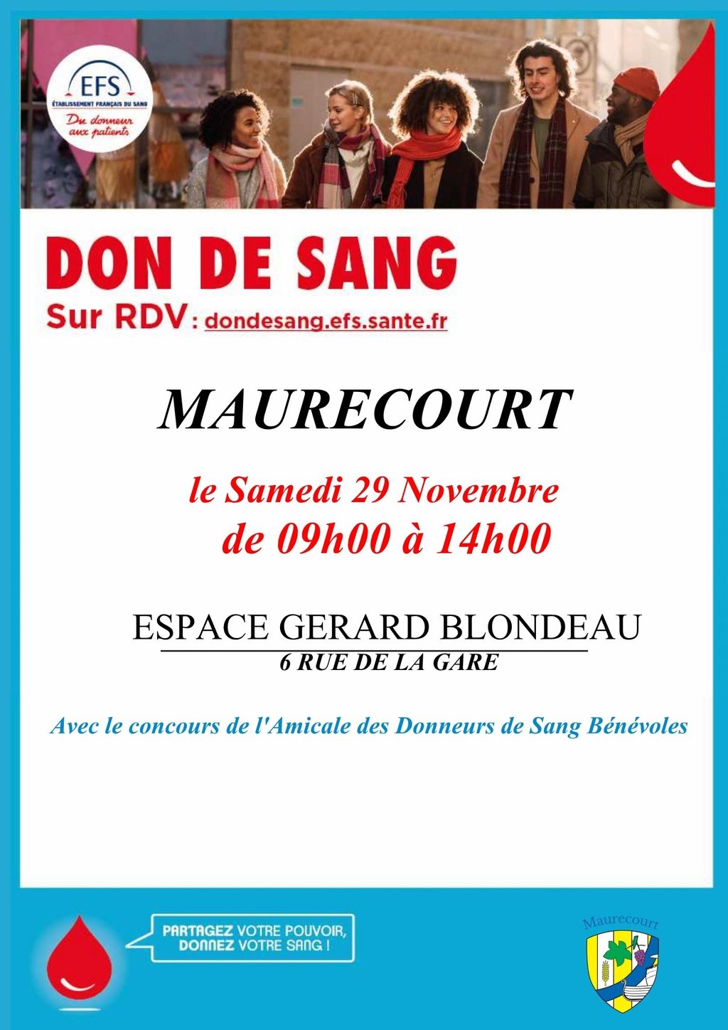 La collecte de sang aura lieu le samedi 29 novembre, de 09h00 à 14h00 à l’Espace Gérard Blondeau