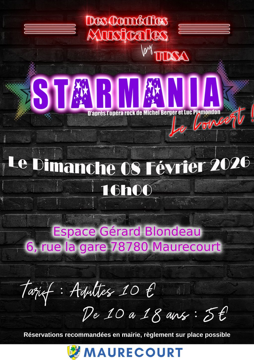 Des comédies musicales by TDSA proposent un concert autour des chansons emblématiques de Starmania, le dimanche 8 février 2026 à 16h.