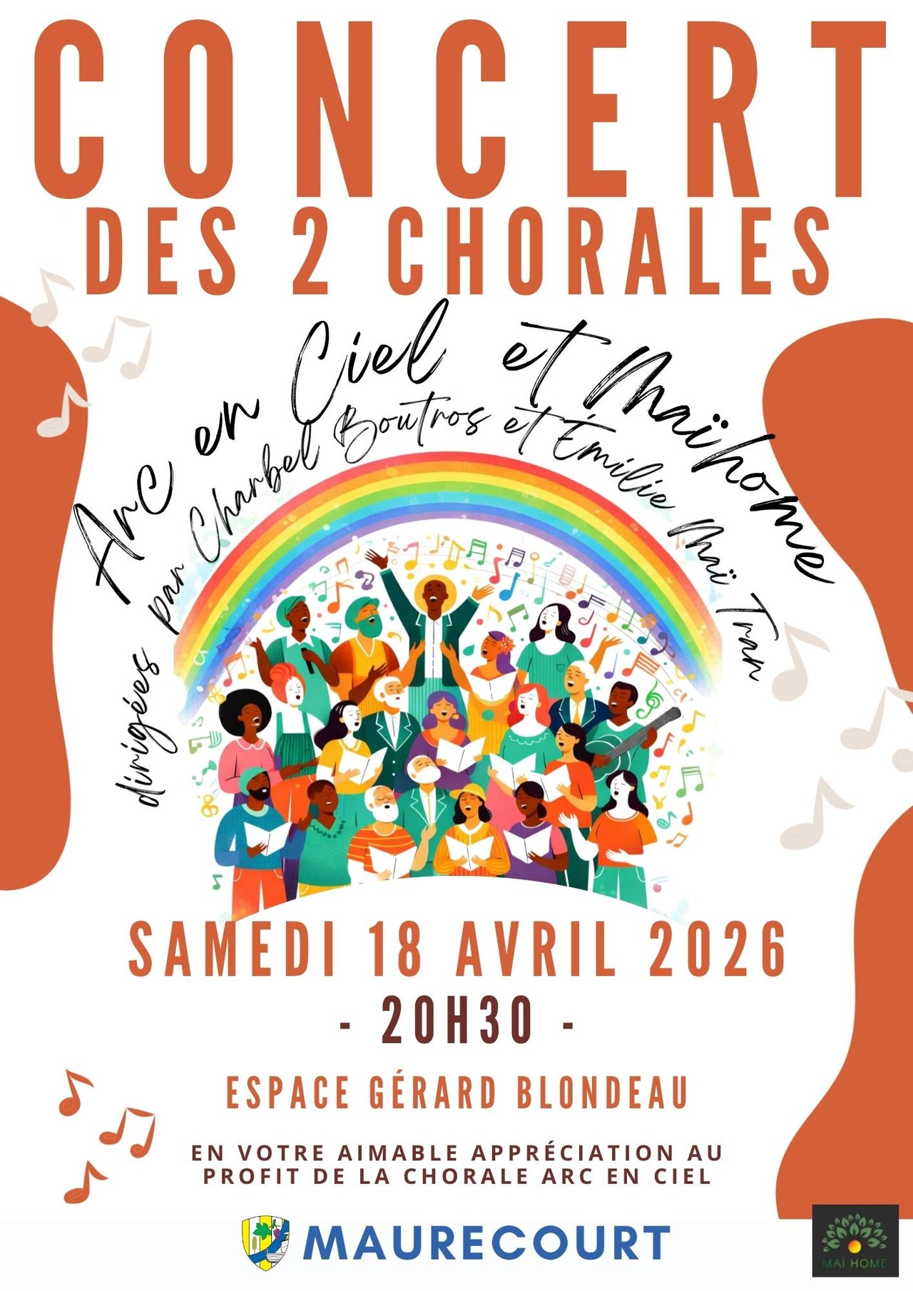 Pour cette édition 2026 du concert de Printemps, Arc En Ciel a choisi d’inviter la Chorale Maïhome. Ainsi deux répertoires différents seront proposés autour d’une même passion : L’harmonie